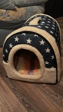 The house is super! Looks like in the picture, sewn neatly, the shape holds well, odorless. The cat climbed into it at once, there are plenty of places. we are happy with it. I recommend the store and the store!