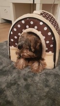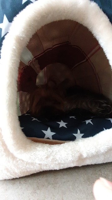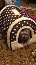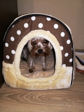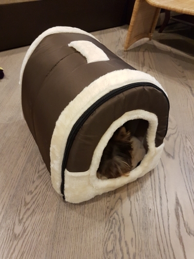 Cool house. The dog immediately climbed. I have yorkshire mini. Size m is the most, places with a margin, will be where to stretch. It is good that the pillow is inner with a lock, wash easily,.